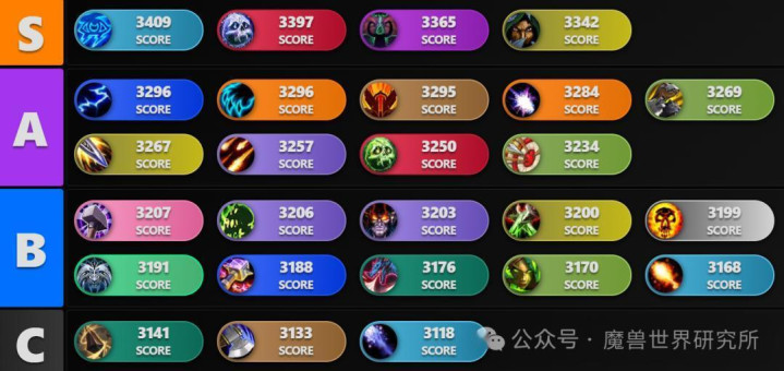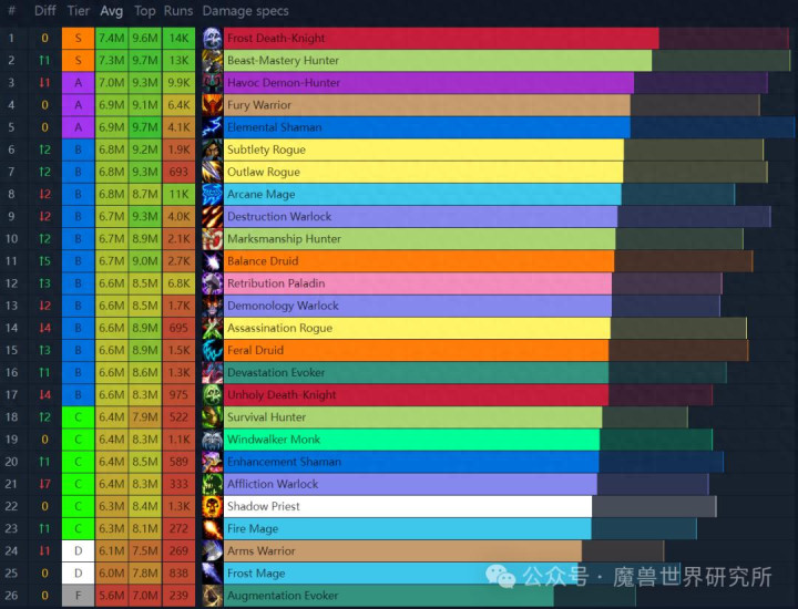 从伤害条来看,S和A级的五个职业——冰DK,兽王猎,浩劫DH,狂暴战和元素萨打出了断层的感觉,平均伤害条确实高着后面DPS不少,也是本版本最强势的几个专精!
