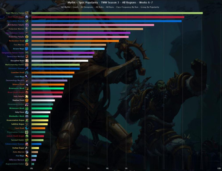 数据来源于Warcraft Logs API。Warcraft Logs 通过将整个大秘境时间内造成的总伤害除以总时间来计算整体 DPS,包括非战斗时段的时间。这与游戏内的插件(如 Details)有所不同,后者通常会显示更高的 DPS 值,但是这样的好处是可以平均的了解一个职业的平均水平,而不局限于任意副本。